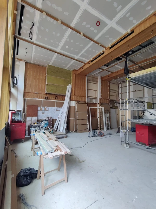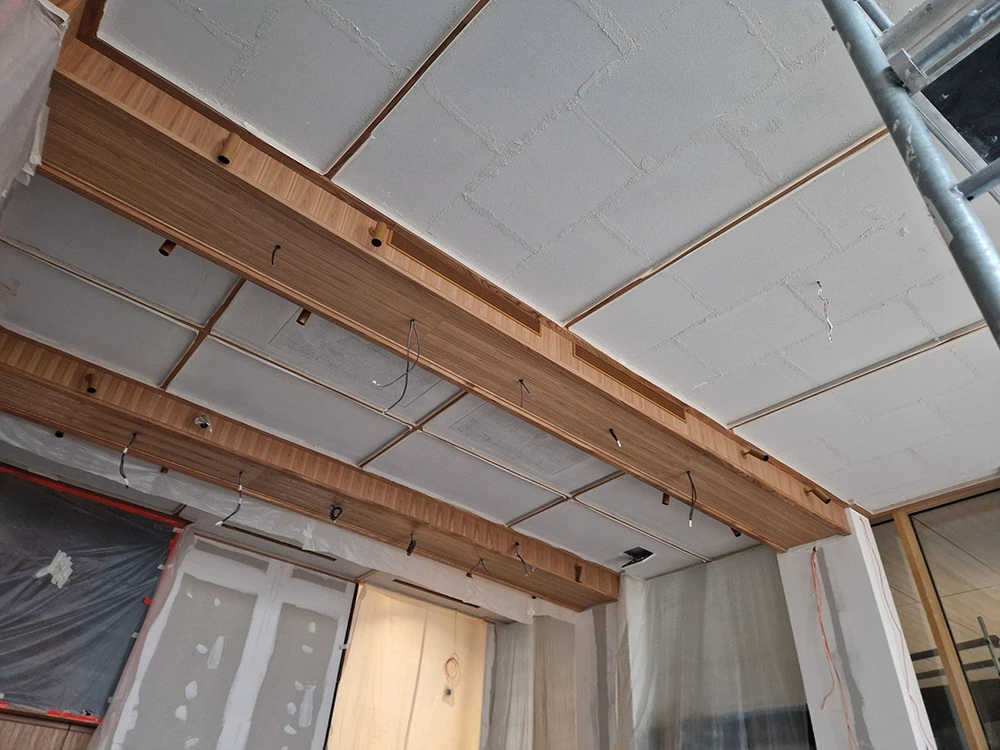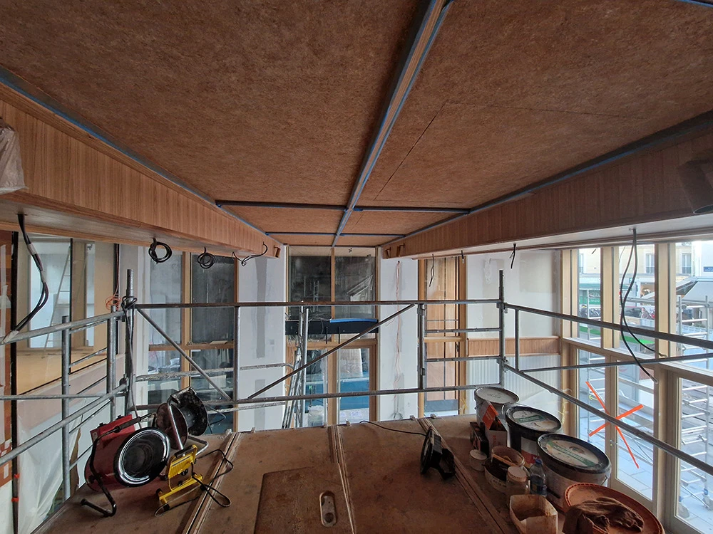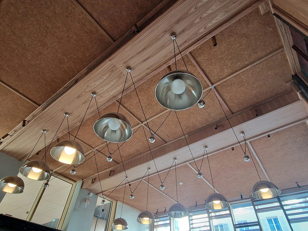 Tous les thèmes décoratifs ne sont pas envisageables et nécessitent une étude. Pour ce projet, un effet « liège » a été demandé. Traiter les surfaces avec une teinte aussi foncée a été un vrai défi surtout au plafond.