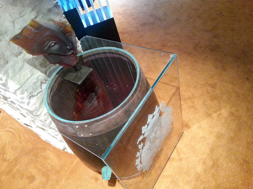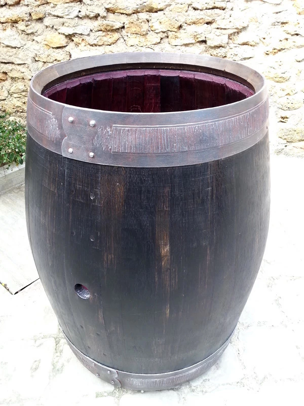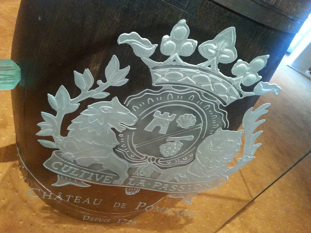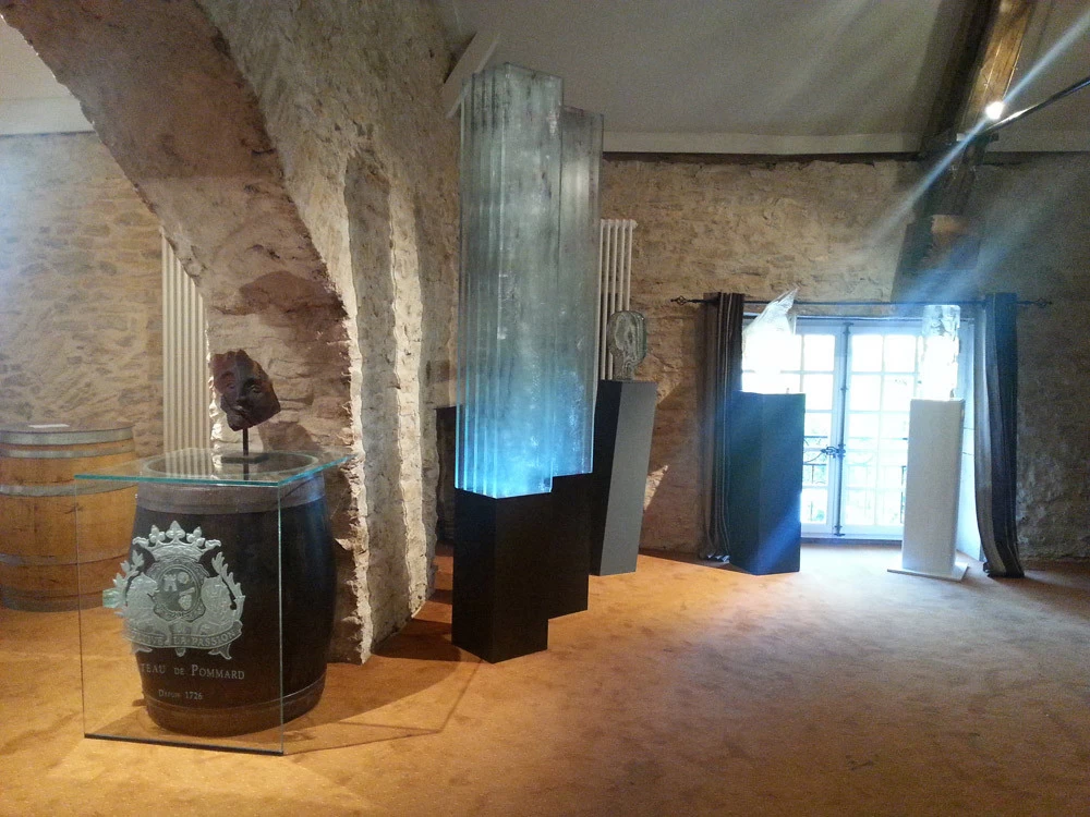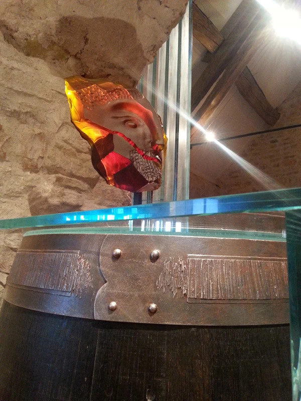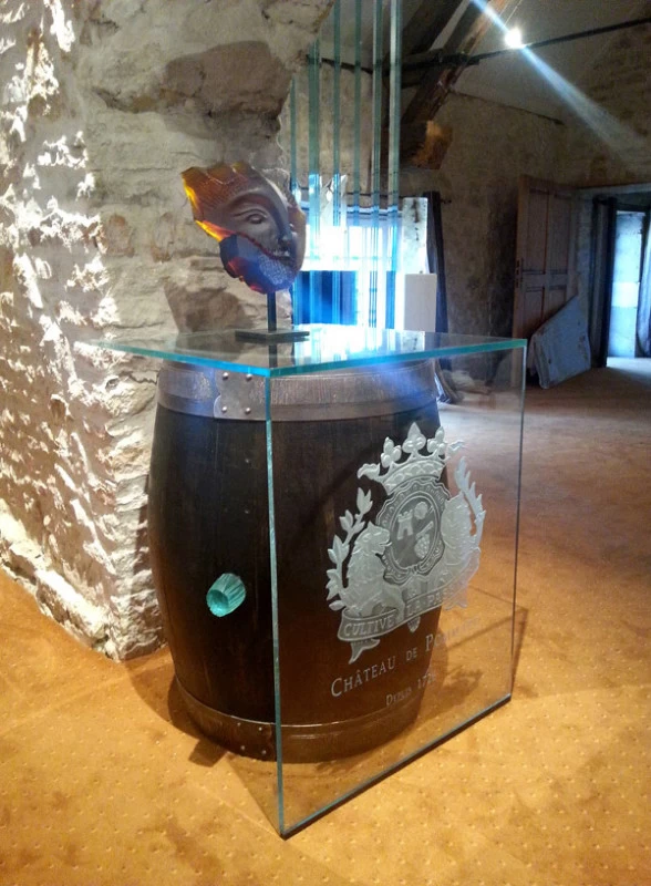 A l’occasion d’une exposition des "Grands Ateliers de France" dans le château Pommard, a été remis à chaque exposant un tonneau afin de laisser libre cours à leur imagination. En collaboration avec Gilles CHABRIER, voici notre interprétation : Un bois noirci usé, plus de cerclage au milieu, le haut et le bas plus large avec un cerclage en matière traité en « faux » métal, l’évidement du tonneau pour respecter la couleur lie de vin du tannin et un verre en L avec les armoiries du Château bien sûr. A noter le bouchon de verre sculpté par le fils de Gilles, Vincent CHABRIER.
