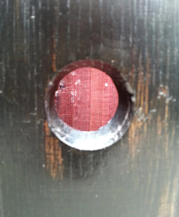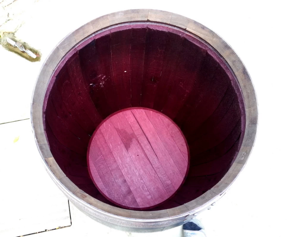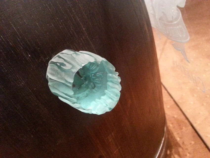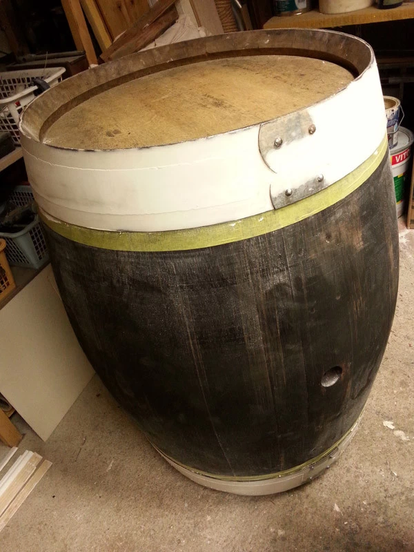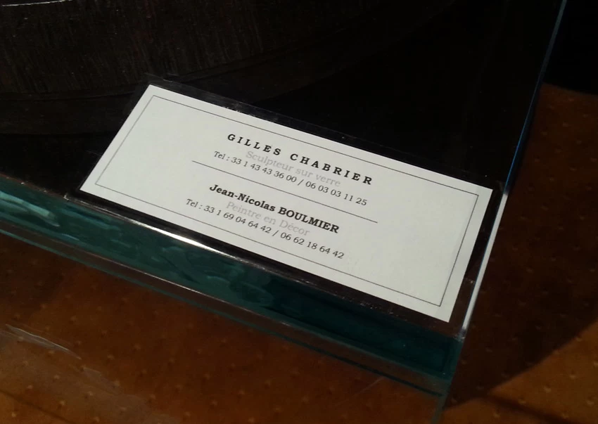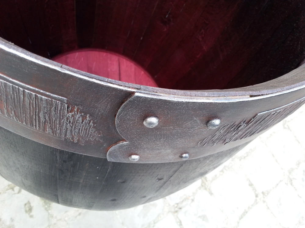 A l’occasion d’une exposition des "Grands Ateliers de France" dans le château Pommard, a été remis à chaque exposant un tonneau afin de laisser libre cours à leur imagination. En collaboration avec Gilles CHABRIER, voici notre interprétation : Un bois noirci usé, plus de cerclage au milieu, le haut et le bas plus large avec un cerclage en matière traité en « faux » métal, l’évidement du tonneau pour respecter la couleur lie de vin du tannin et un verre en L avec les armoiries du Château bien sûr. A noter le bouchon de verre sculpté par le fils de Gilles, Vincent CHABRIER.