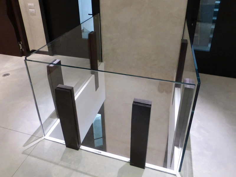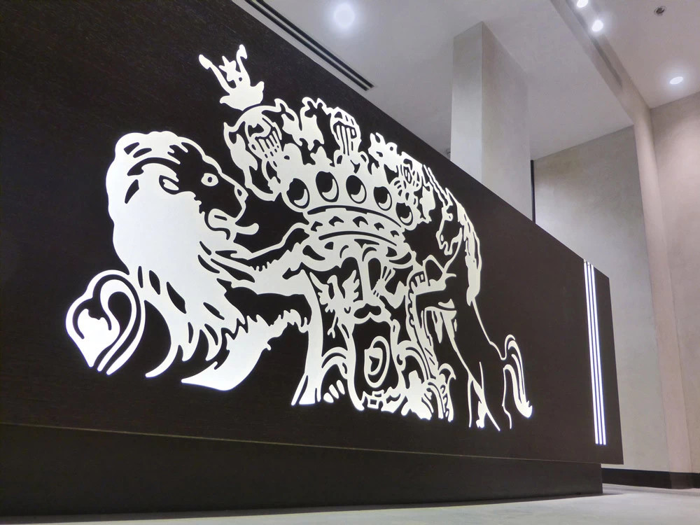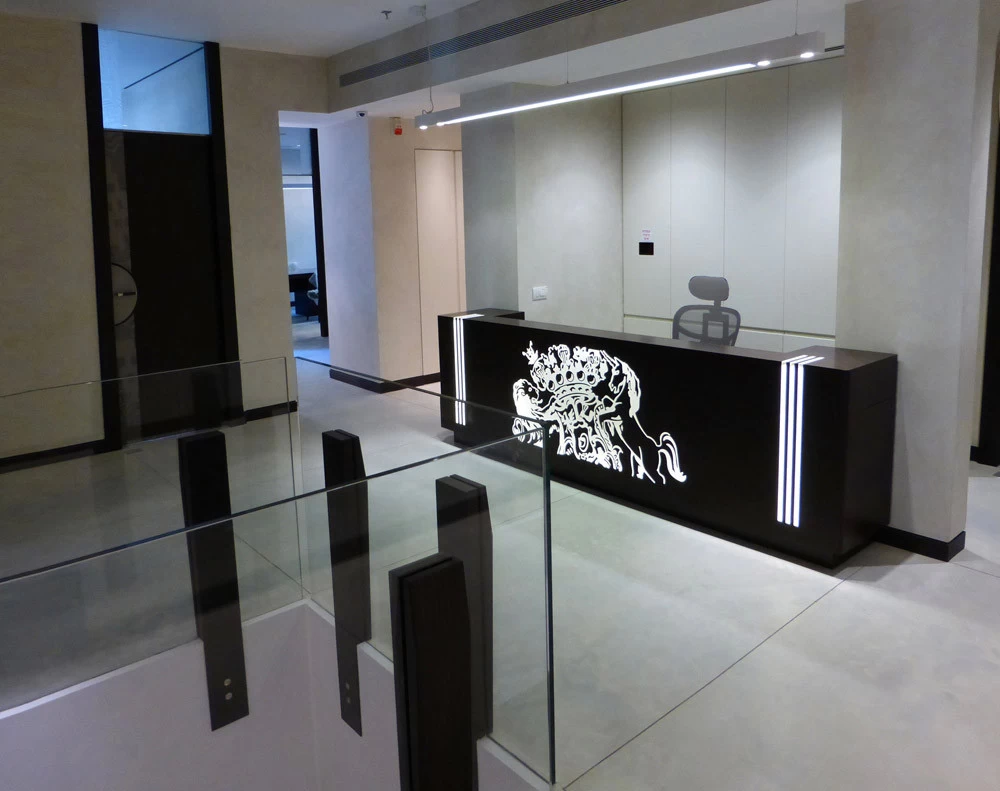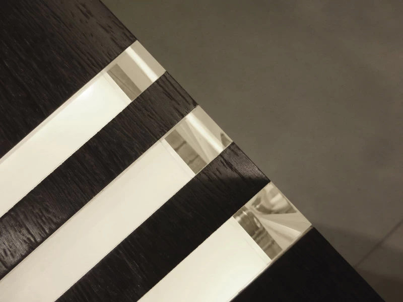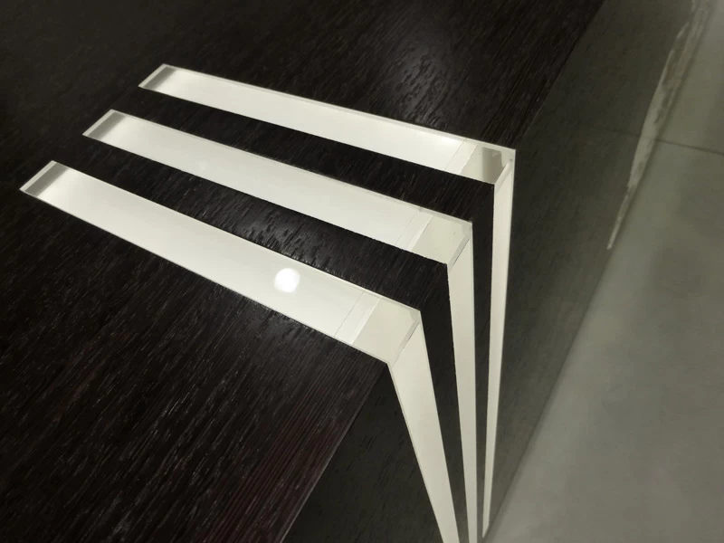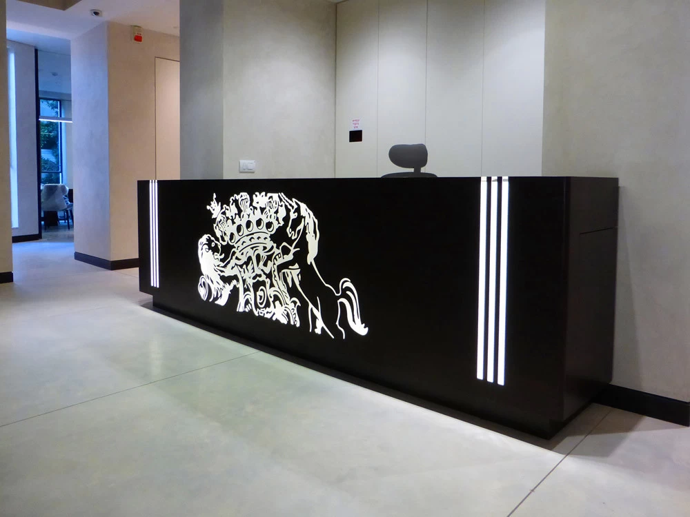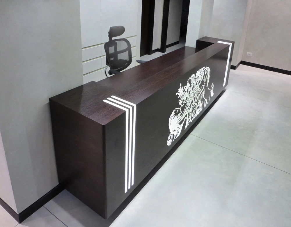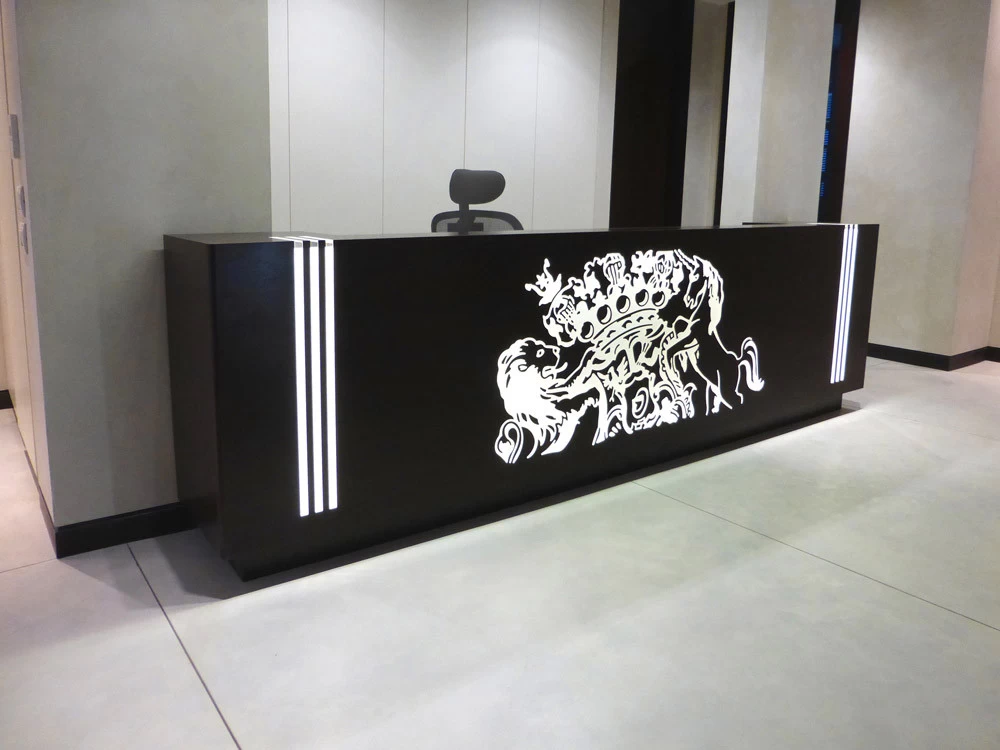 Création d’une banque d’accueil avec les ateliers EMG à Coignières en France. Technique de placage Wengé sur une feuille de plexiglas épaisse rétroéclairée.