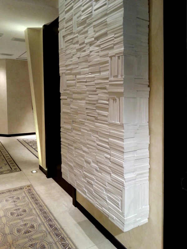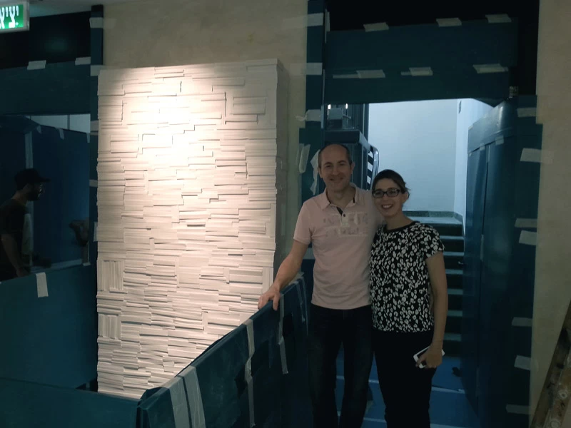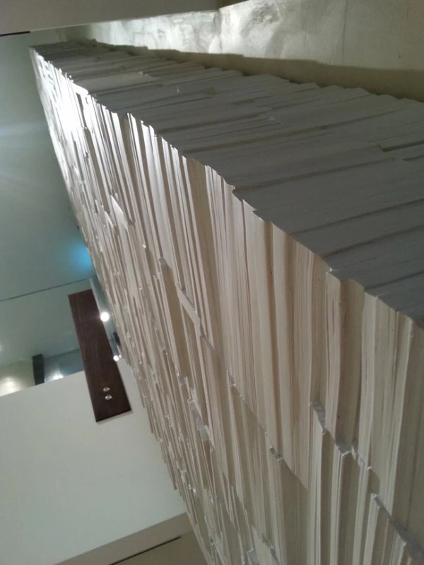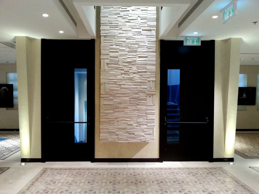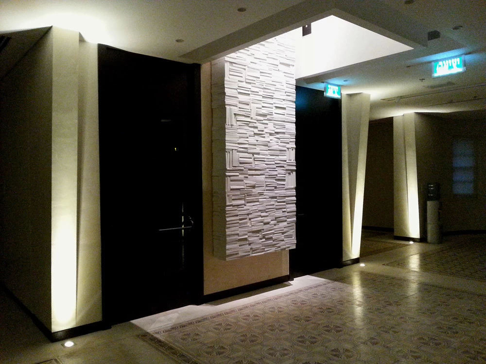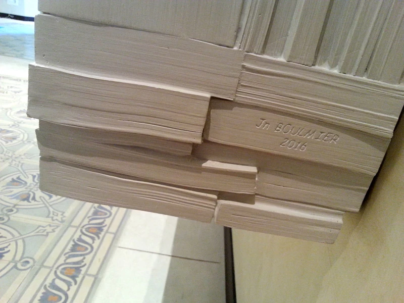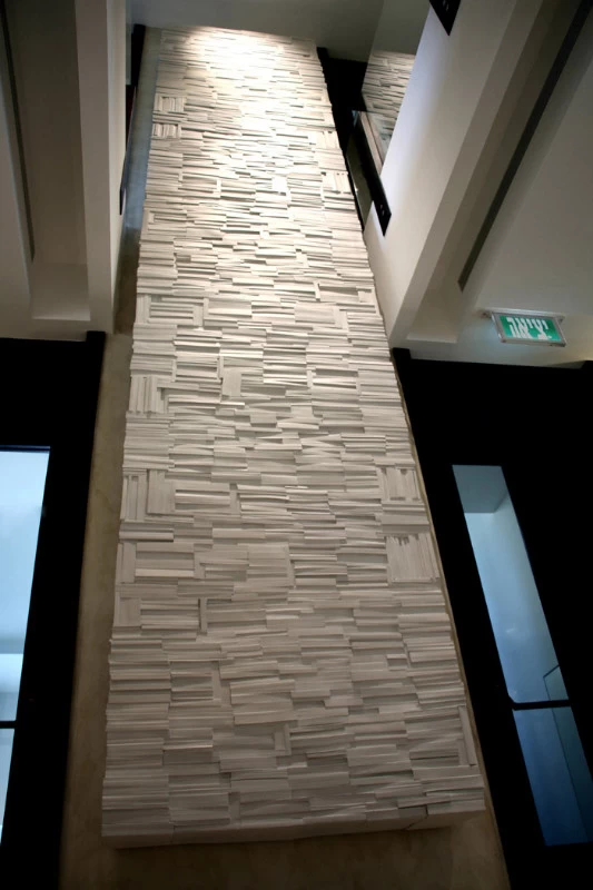 Pour la Fondation Césaré (Caesarea) à Tel Aviv, voici un mur de livres monumental, qui symbolise la culture, la connaissance et l’enseignement. L’objectif de cette fondation étant d’attribuer des bourses pour aider les étudiants à prolonger leurs études et projets dans les hautes écoles. Les empreintes et moulages issu des « cubes de livres » ou « tableaux de livres » créés par mes soins et issu de la collection Blanche des Éditions Gallimard, ont été réalisés par un plasticien, afin de réaliser un assemblage mesurant plus de 5 mètres de hauteur.