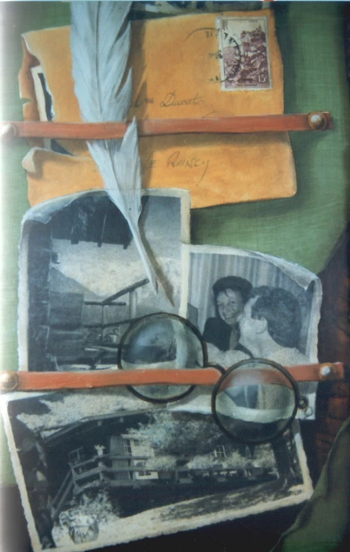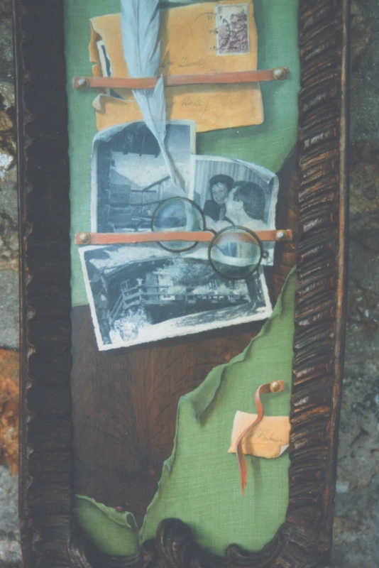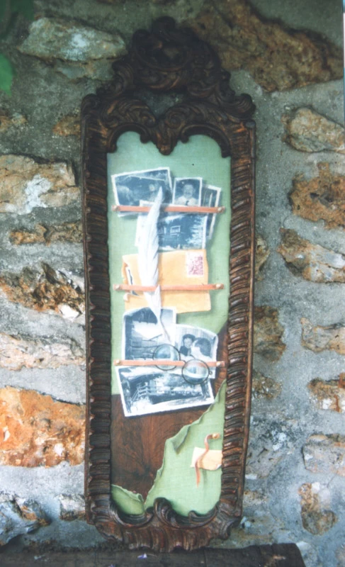 D’après un cadre d’époque qui m’a été fourni, voici la création d’un pêle-mêle avec de réelles photos, scannées, éditées en noir et blanc puis collées et retravaillées à l’huile. Seul le timbre poste est vrai et simplement collé !