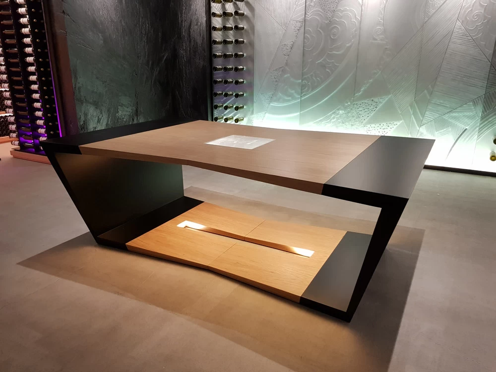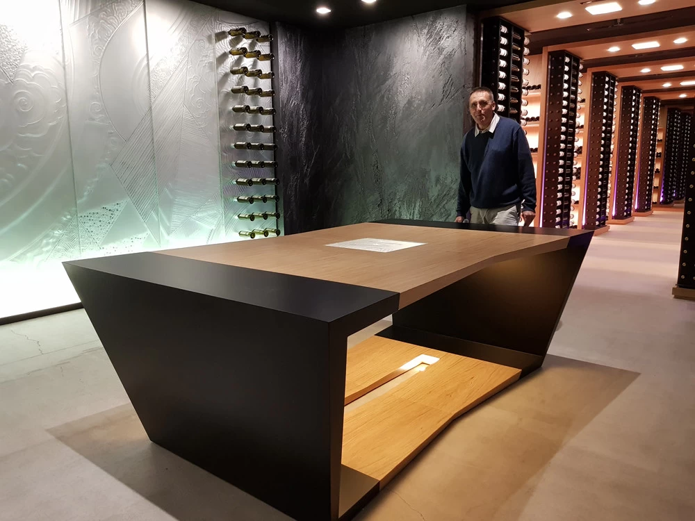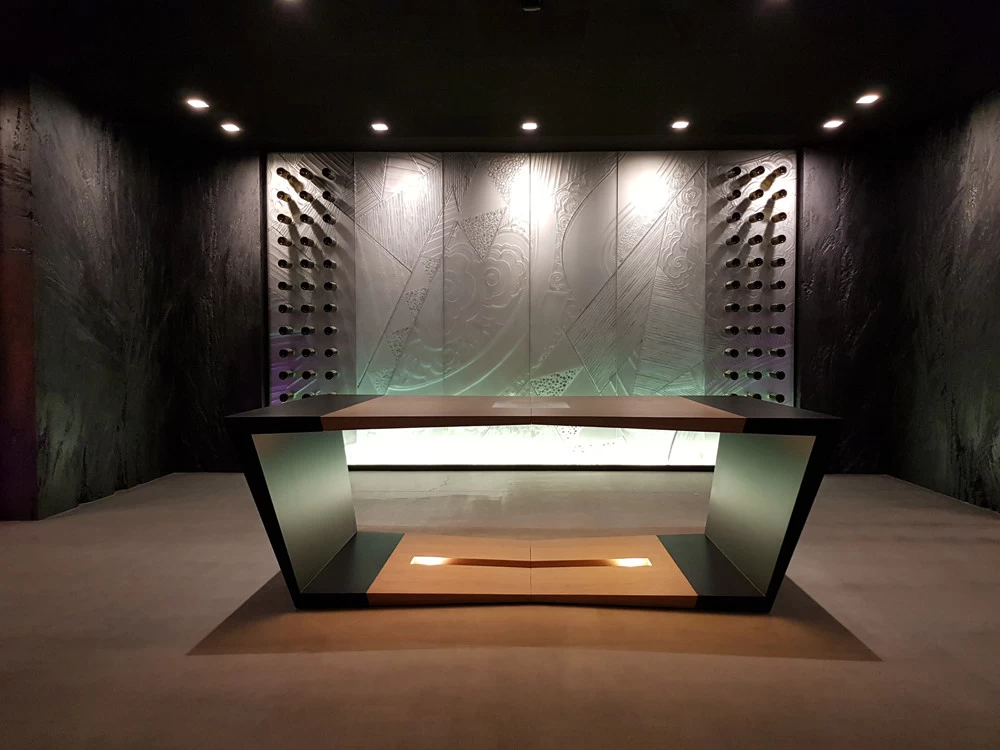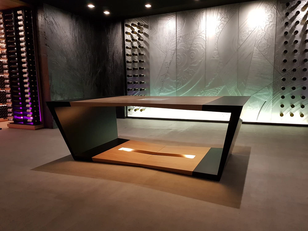 Pour cette cave historique en Espagne dénommée Macán, voici une table dessinée par mes soins et réalisée par les ateliers de menuiserie Séquoia à Épône et les ateliers de serrurerie Petit Chanon à Egly. L’idée était de laisser le visuel vers la paroi en verre sculptée et rétroéclairée sur l’arrière de la pièce.