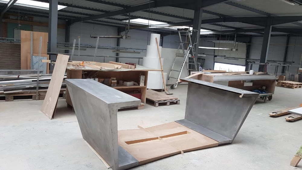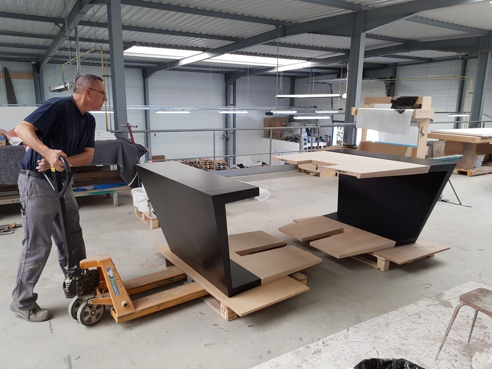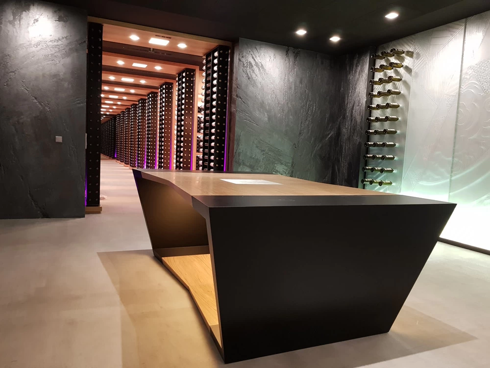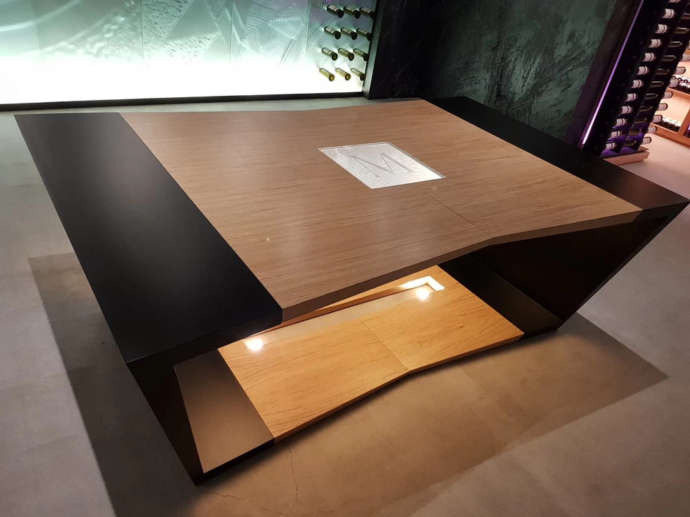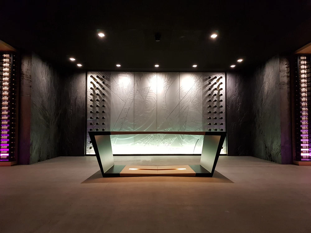 Pour cette cave historique en Espagne dénommée Macán, voici une table dessinée par mes soins et réalisée par les ateliers de menuiserie Séquoia à Épône et les ateliers de serrurerie Petit Chanon à Egly. L’idée était de laisser le visuel vers la paroi en verre sculptée et rétroéclairée sur l’arrière de la pièce.