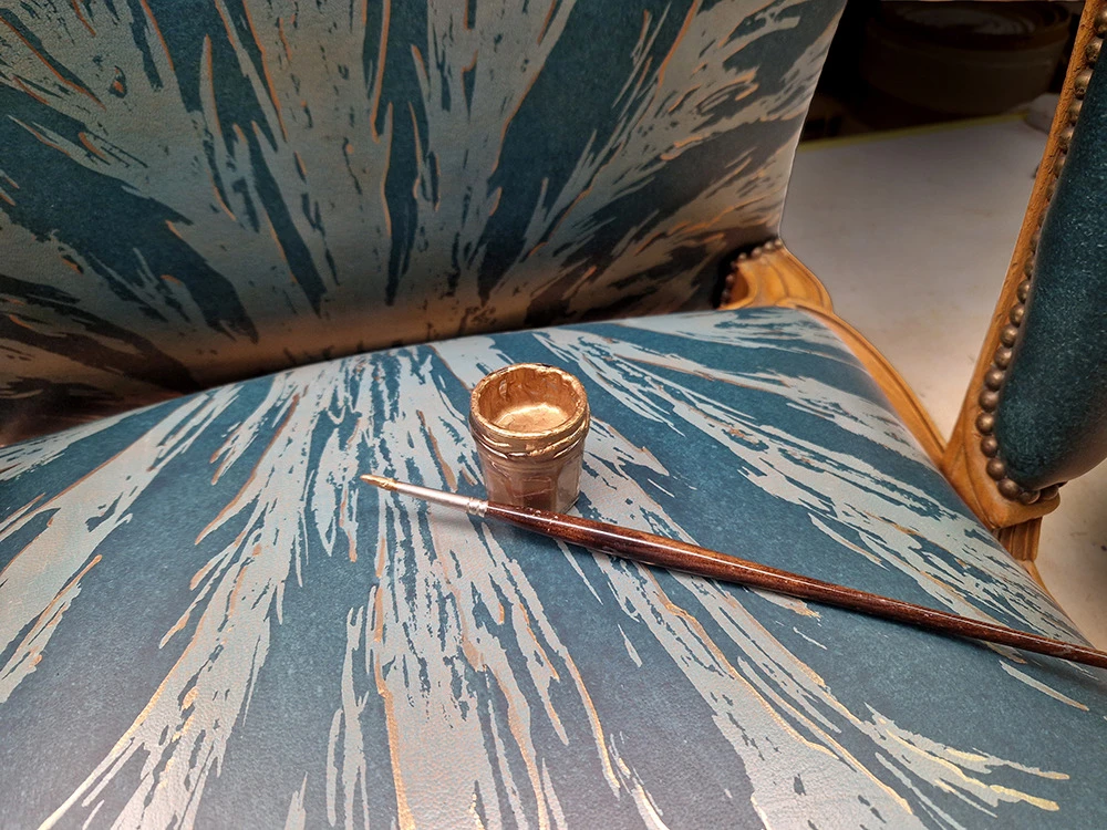 En finition, quelques rehauts dorés ont été peints pour surligner et donner un contraste mat/brillant au décor.