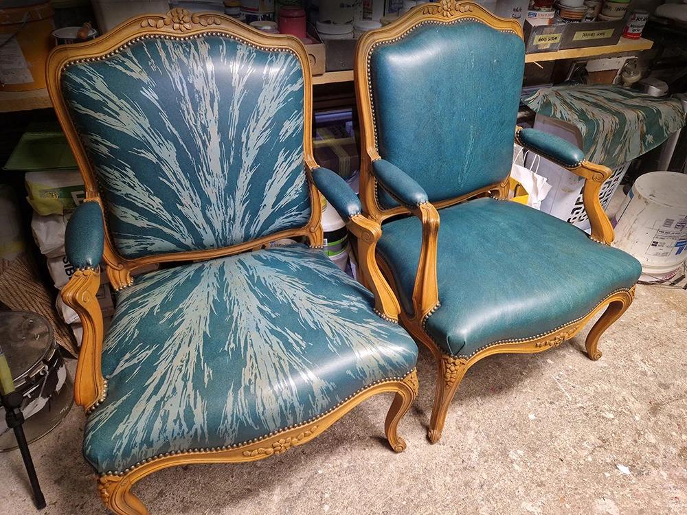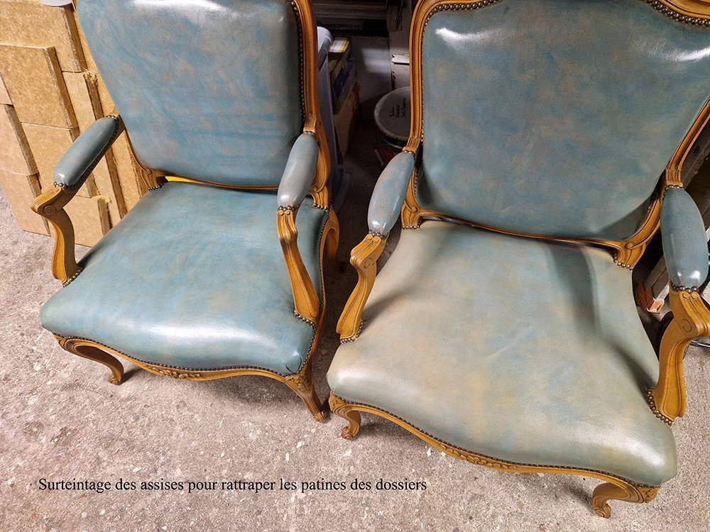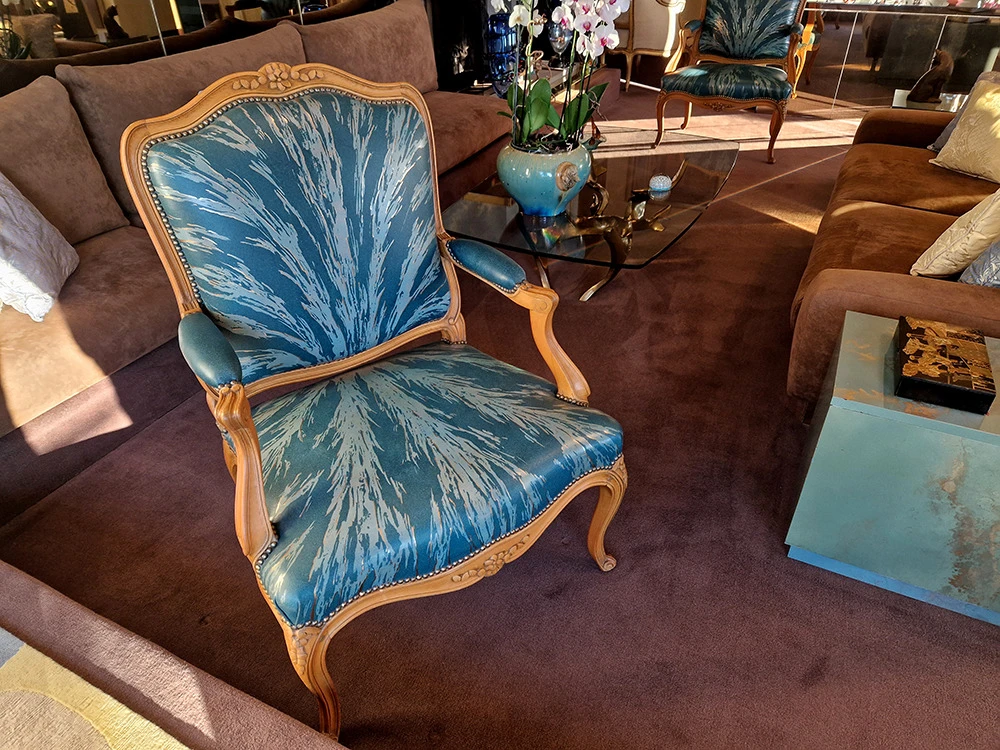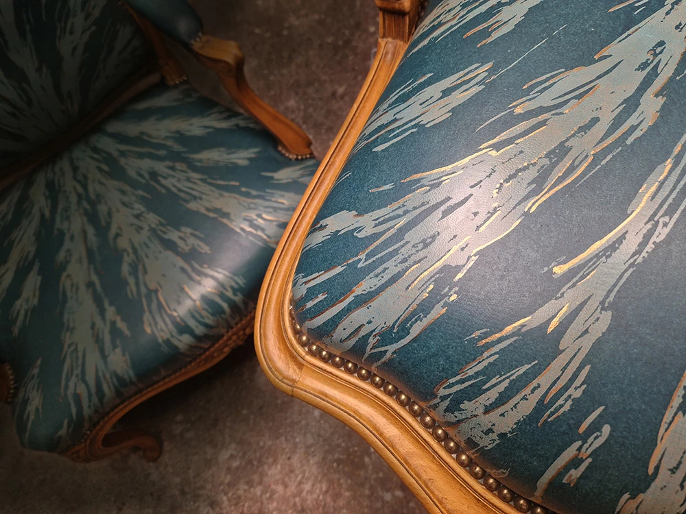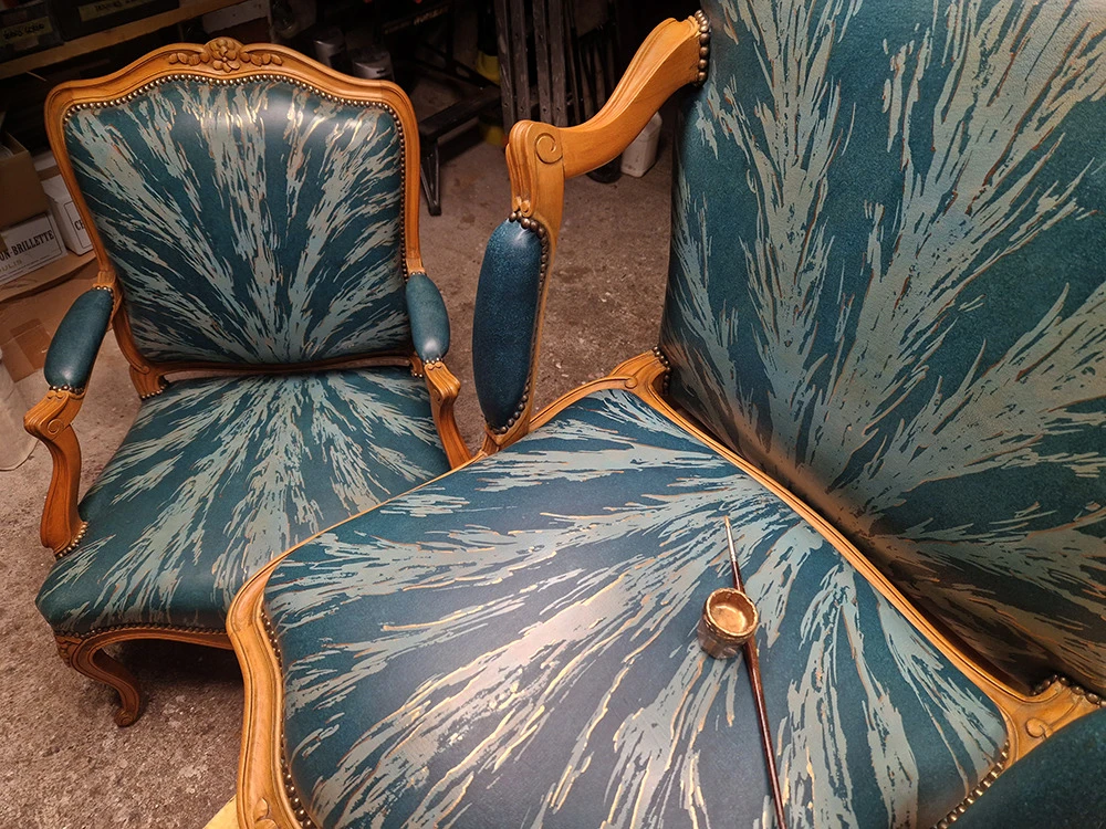 Ces bergères en cuir avaient des patines qui s’étaient estompées avec la lumière et l’usure. L’idée a été de les reteinter et d’y apporter une décoration d’inspiration « zèbre ».