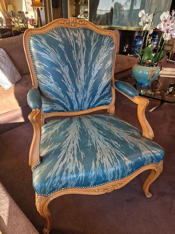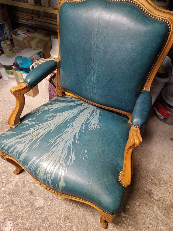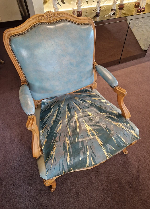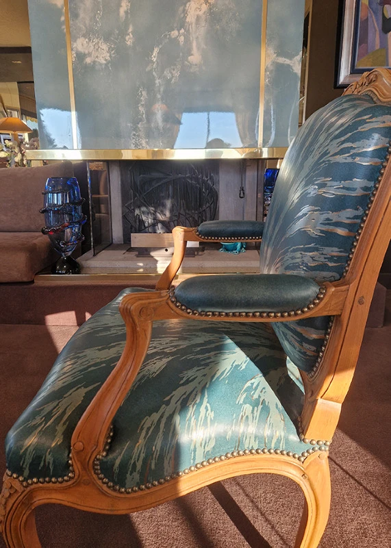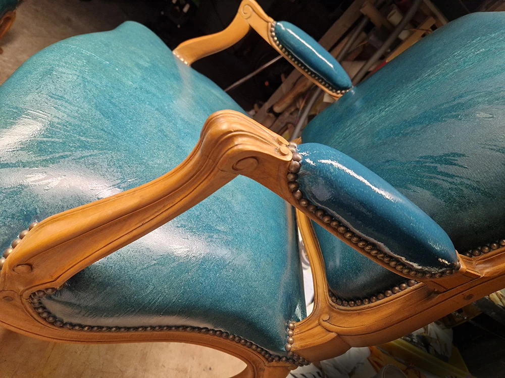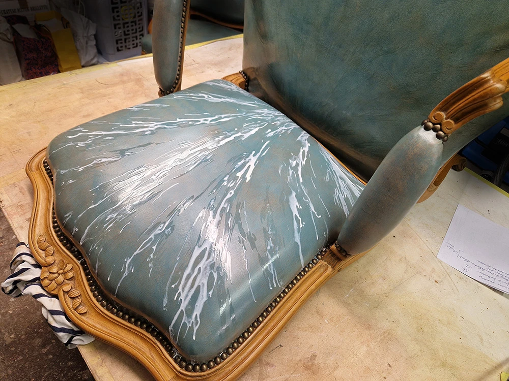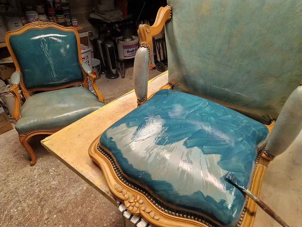 Ces bergères en cuir avaient des patines qui s’étaient estompées avec la lumière et l’usure. L’idée a été de les reteinter et d’y apporter une décoration d’inspiration « zèbre ».