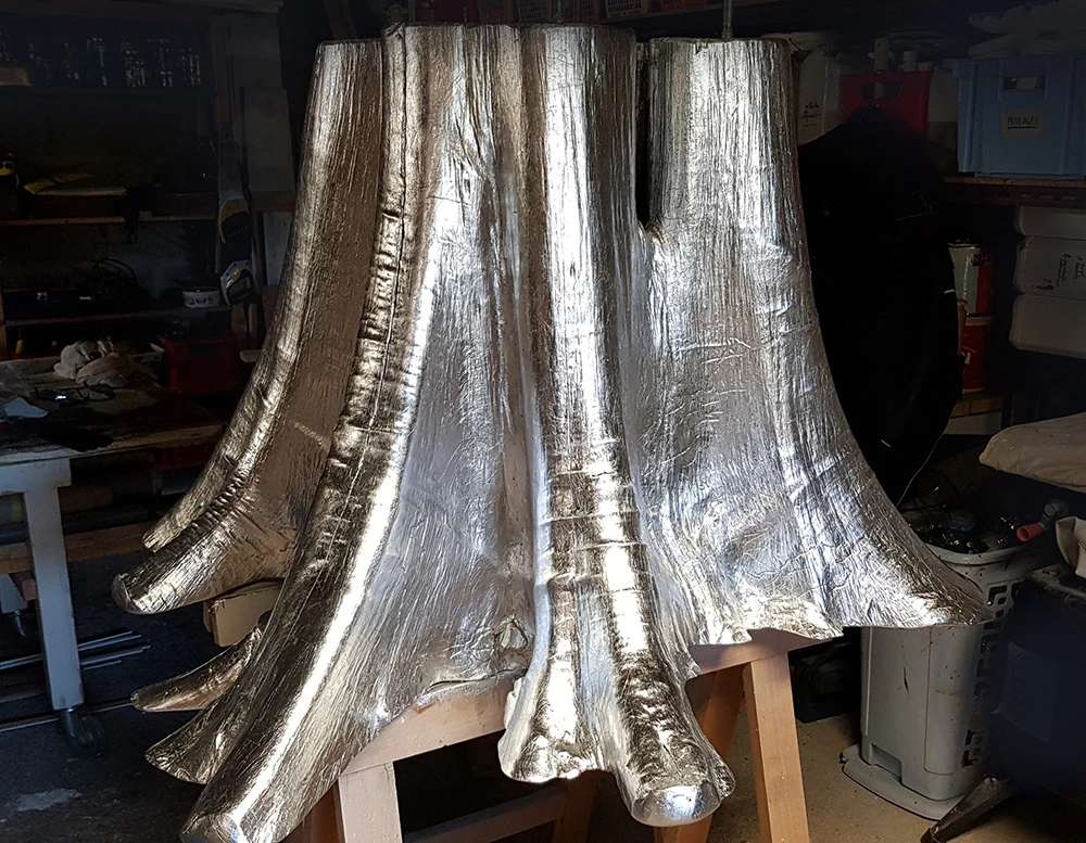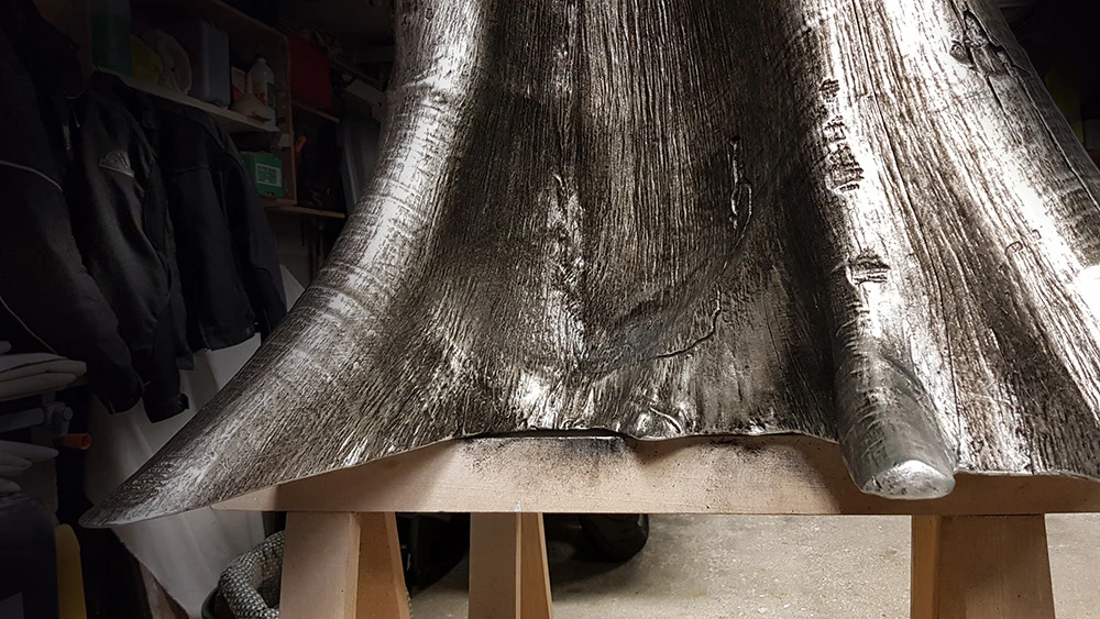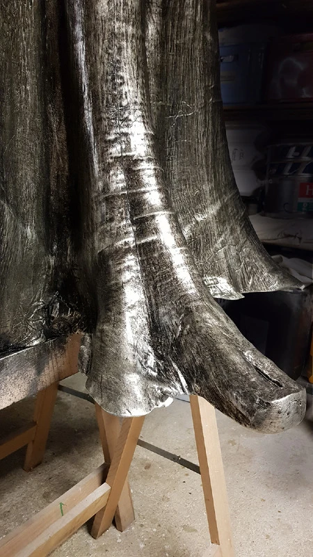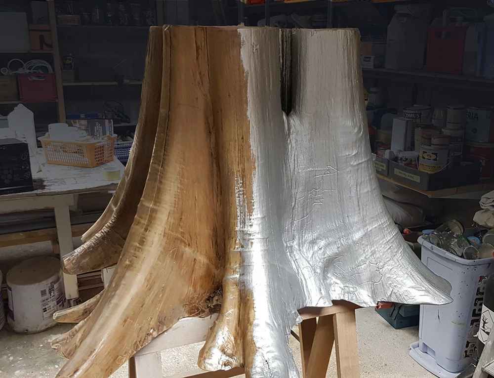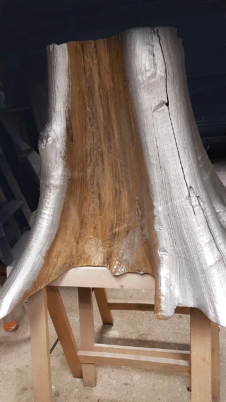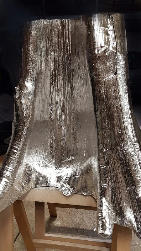 Voici l’embase d’un tronc de Bali qui a été argenté à la feuille métallique. Une patine légèrement noircie a été essuyée en finition.