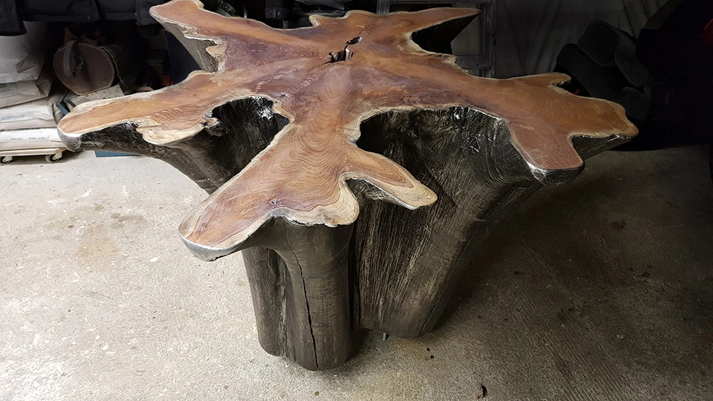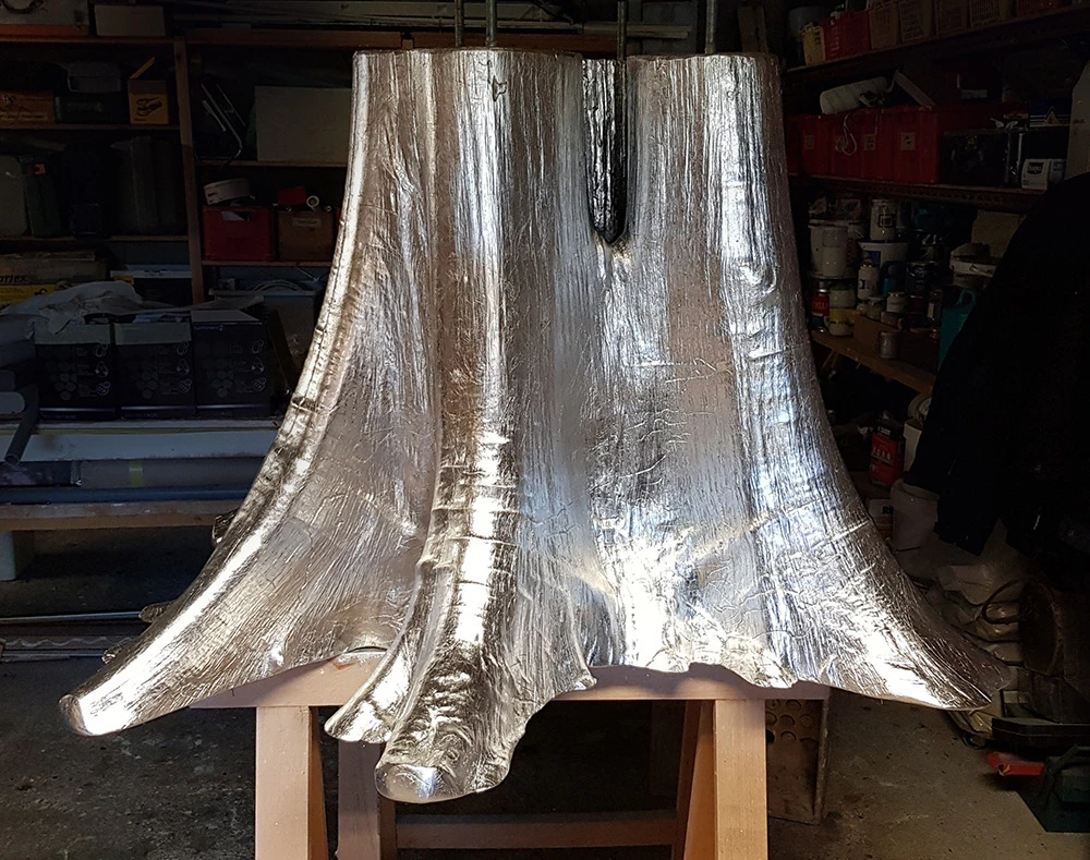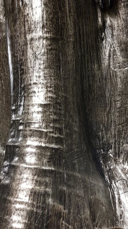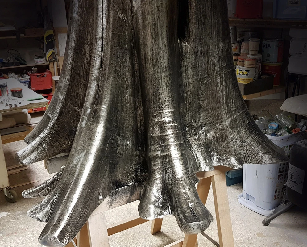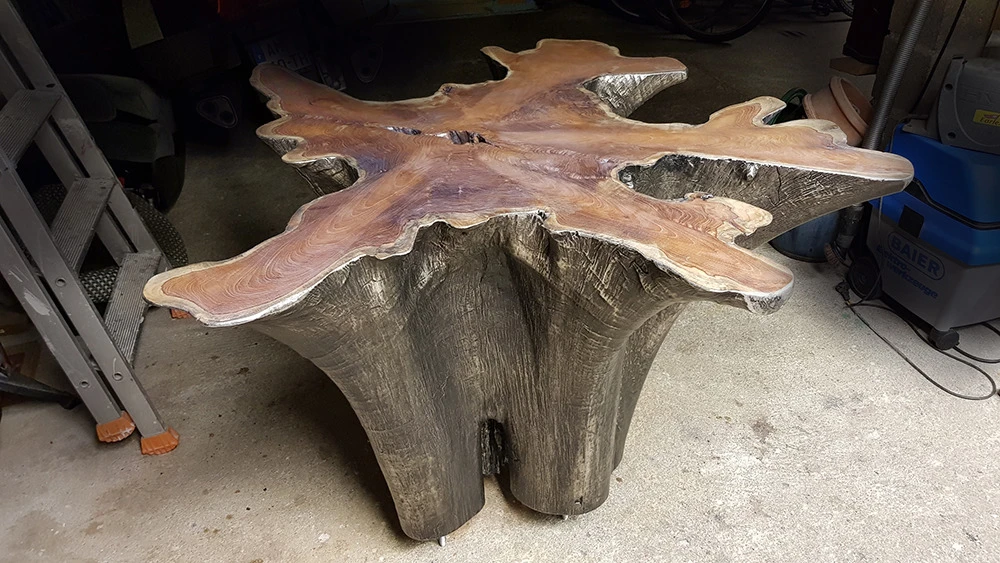 Voici l’embase d’un tronc de Bali qui a été argenté à la feuille métallique. Une patine légèrement noircie a été essuyée en finition.