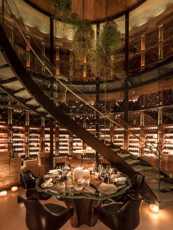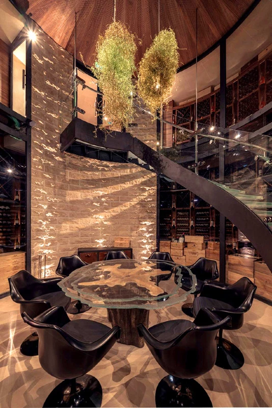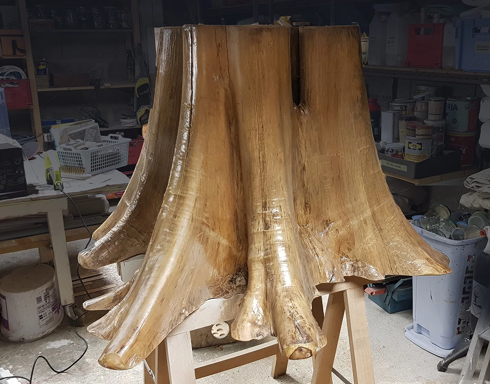 Une fois retournée cette embase sert de pied de table au sein de la cave de l’établissement.