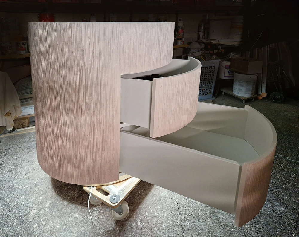 Ce meuble de présentation pour les parfums Caron fut réalisé par Didier Demé, menuisier ébéniste. Les patines fortement tramées ont été patinées, dégradées en partant d’un blanc en haut et d’un rose poudré en bas.