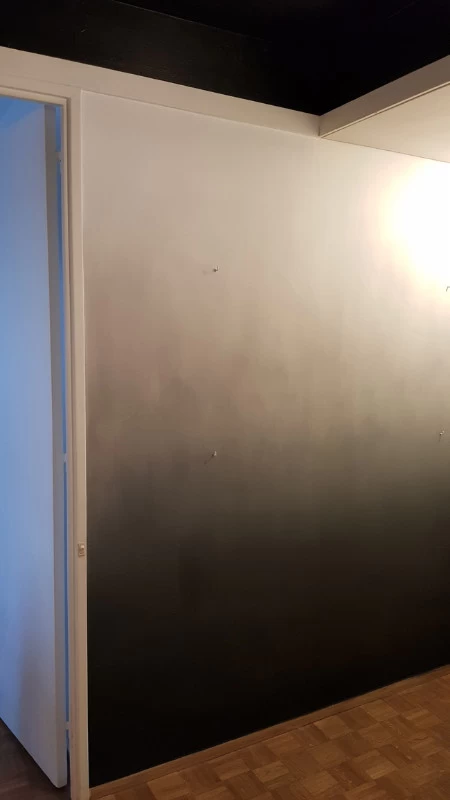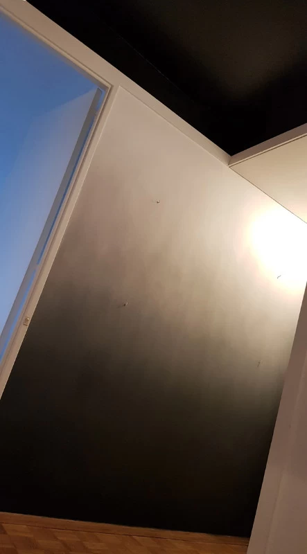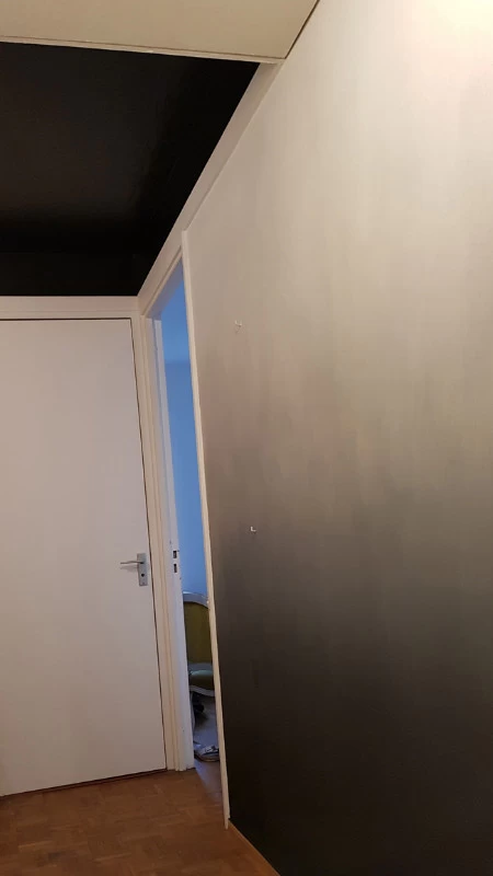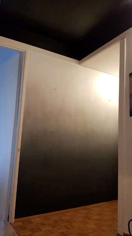 Voici une peinture ou patine qui se marie parfaitement avec les plafonds noirs de cet appartement. Situé à Paris Montparnasse, l'architecte Jean Dubuisson livra dès l'origine en 1964 des appartements blanc avec des plafonds noir dans les dégagements et couloirs uniquement.