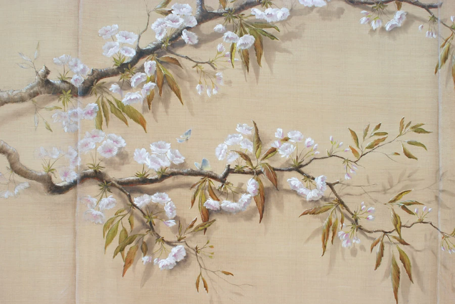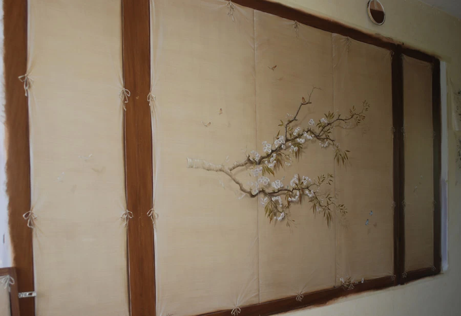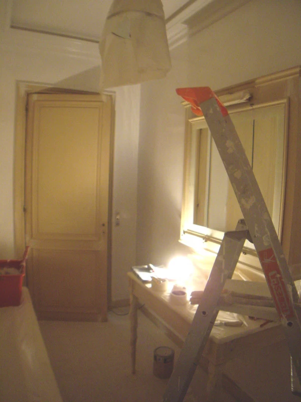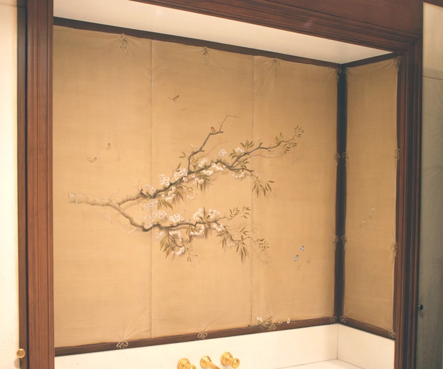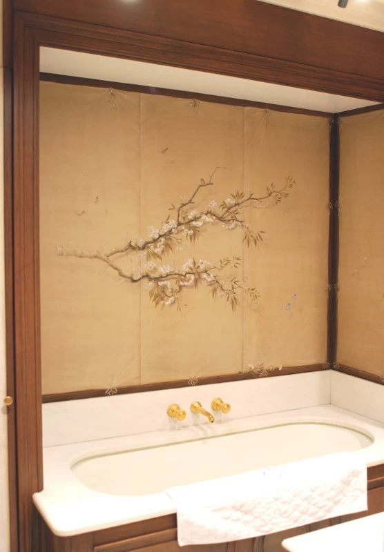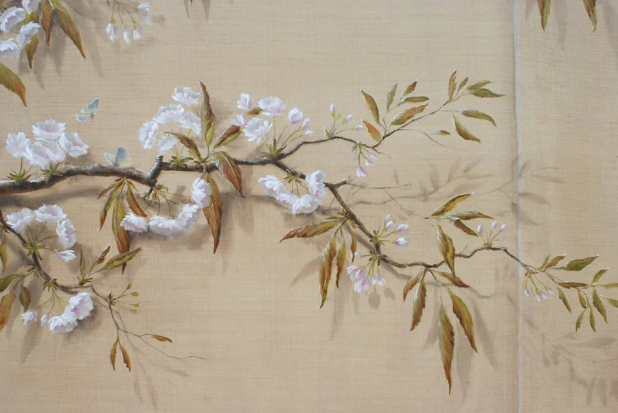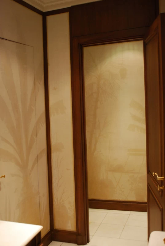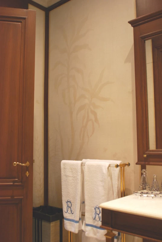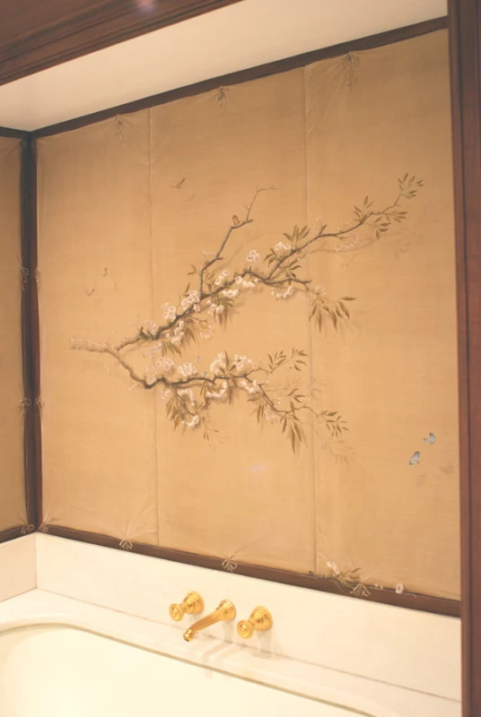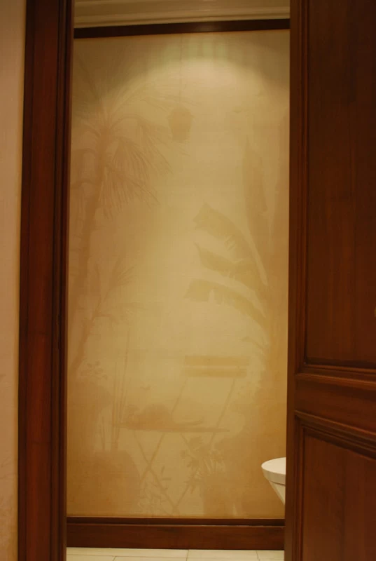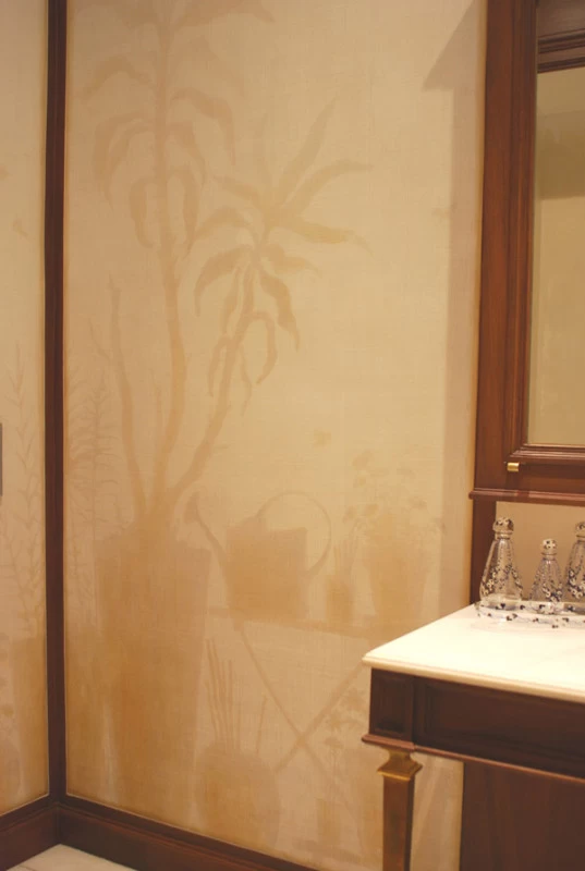 Voici une salle de bains étroite, sans fenêtre, sans verdure ni perspective qui nécessitait que l’on « repousse » ses murs. L’idée a été d’imaginer des plantes et accessoires de jardiniers derrière de fausses cloisons de tissu tendu afin de n’en déceler que le jeu des ombrages. Un faux bois général dans toute la pièce pour justifier les cadres de soutien du faux tissu. Au dessus de la baignoire, j’ai imaginé que l’on ait pu accrocher par de simples nœuds une (fausse) toile de lin qui relate un dessin d’atelier. Une branche de cerisier dont le dessin à la craie commencerait à gauche, dont on verrait ensuite l’évolution vers la peinture, jusqu’au trompe l’œil poussé puisque les pétales et fleurs finissent par en tomber.