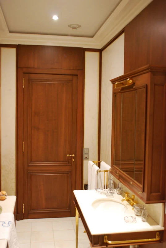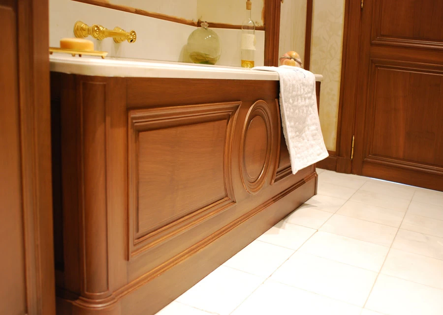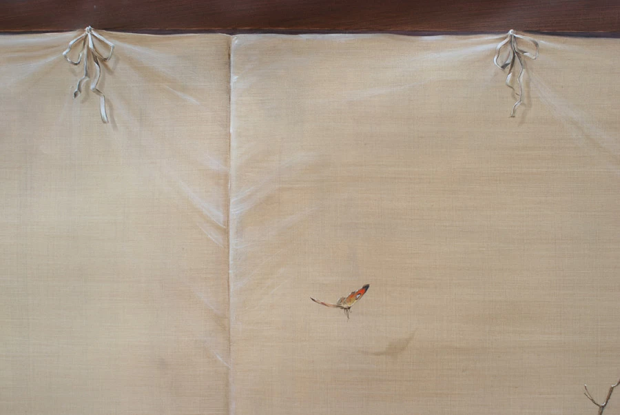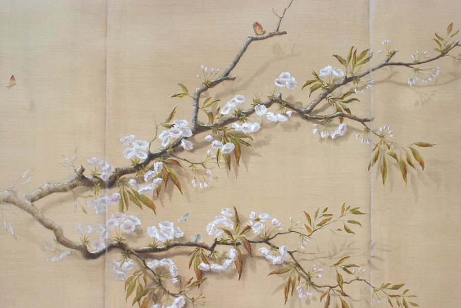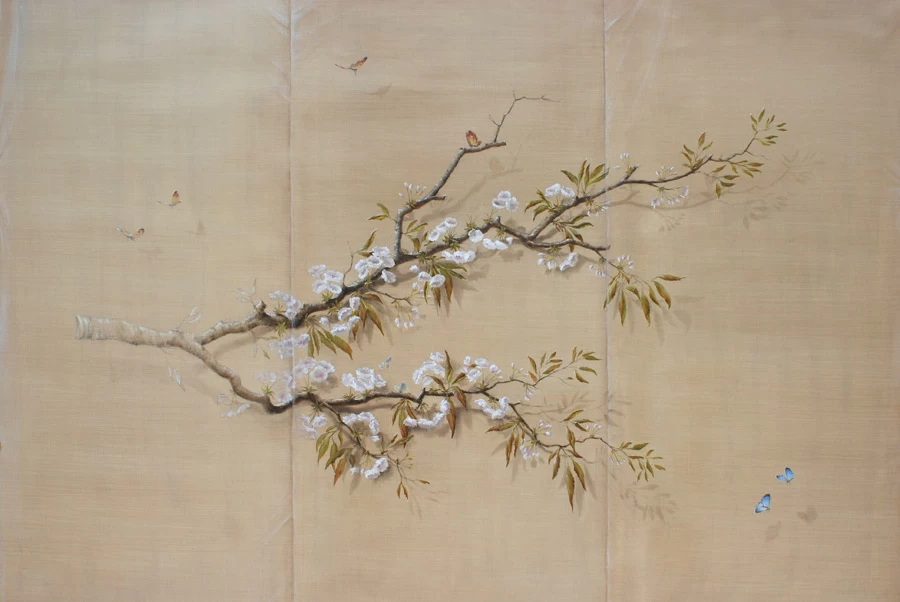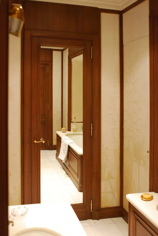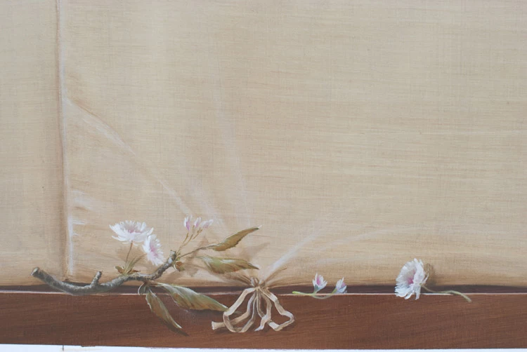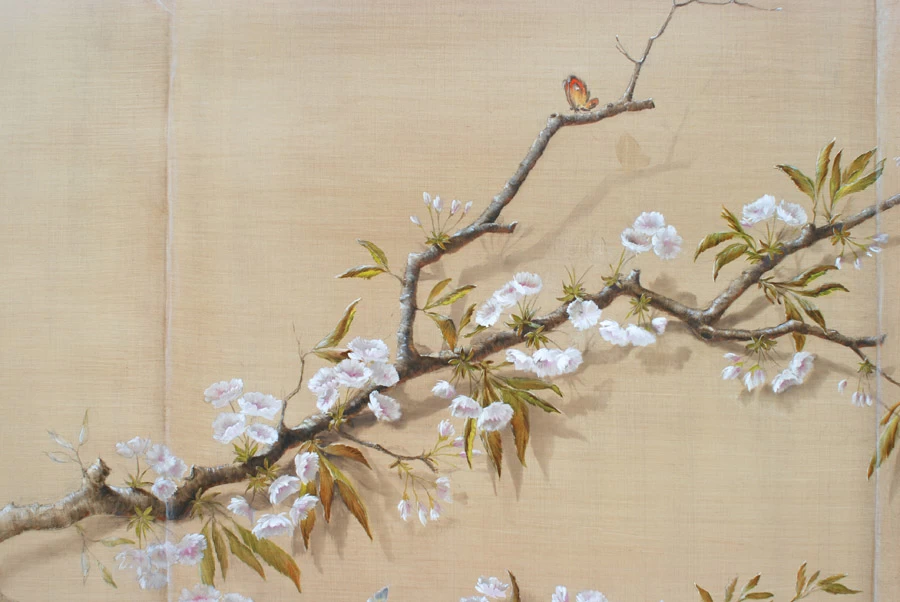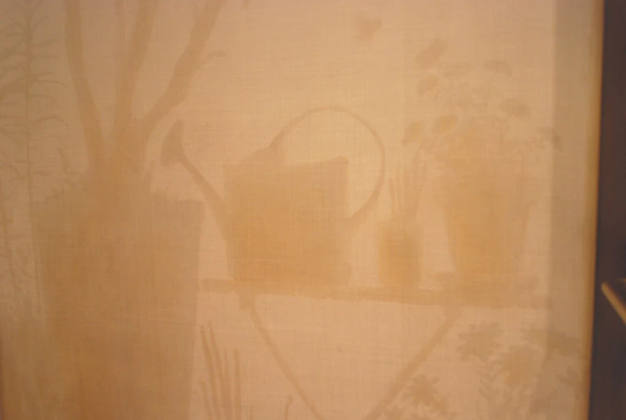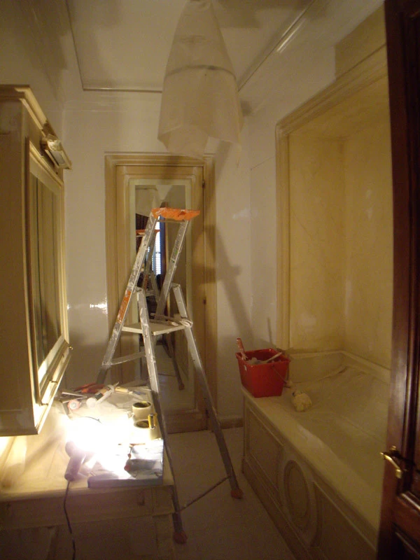 Voici une salle de bains étroite, sans fenêtre, sans verdure ni perspective qui nécessitait que l’on « repousse » ses murs. L’idée a été d’imaginer des plantes et accessoires de jardiniers derrière de fausses cloisons de tissu tendu afin de n’en déceler que le jeu des ombrages. Un faux bois général dans toute la pièce pour justifier les cadres de soutien du faux tissu. Au dessus de la baignoire, j’ai imaginé que l’on ait pu accrocher par de simples nœuds une (fausse) toile de lin qui relate un dessin d’atelier. Une branche de cerisier dont le dessin à la craie commencerait à gauche, dont on verrait ensuite l’évolution vers la peinture, jusqu’au trompe l’œil poussé puisque les pétales et fleurs finissent par en tomber.