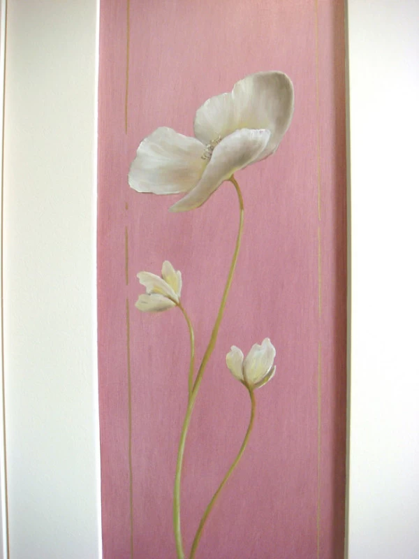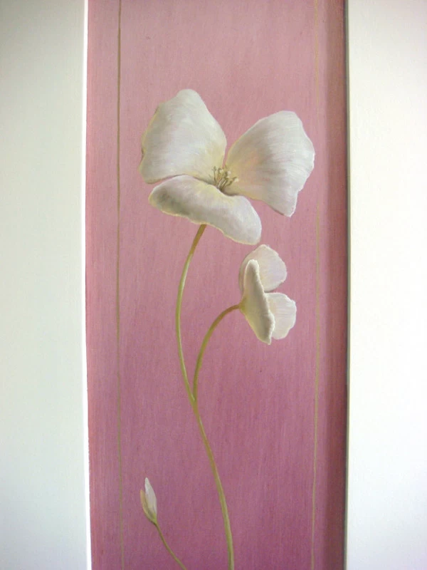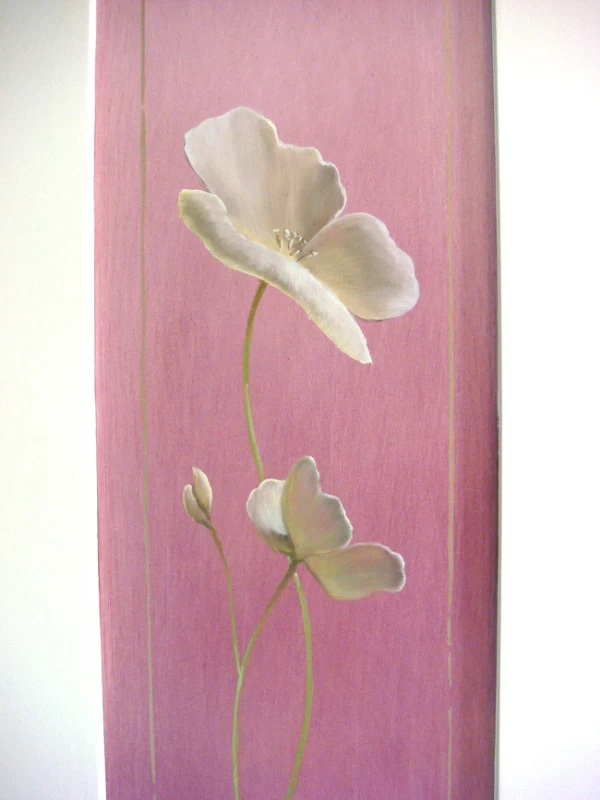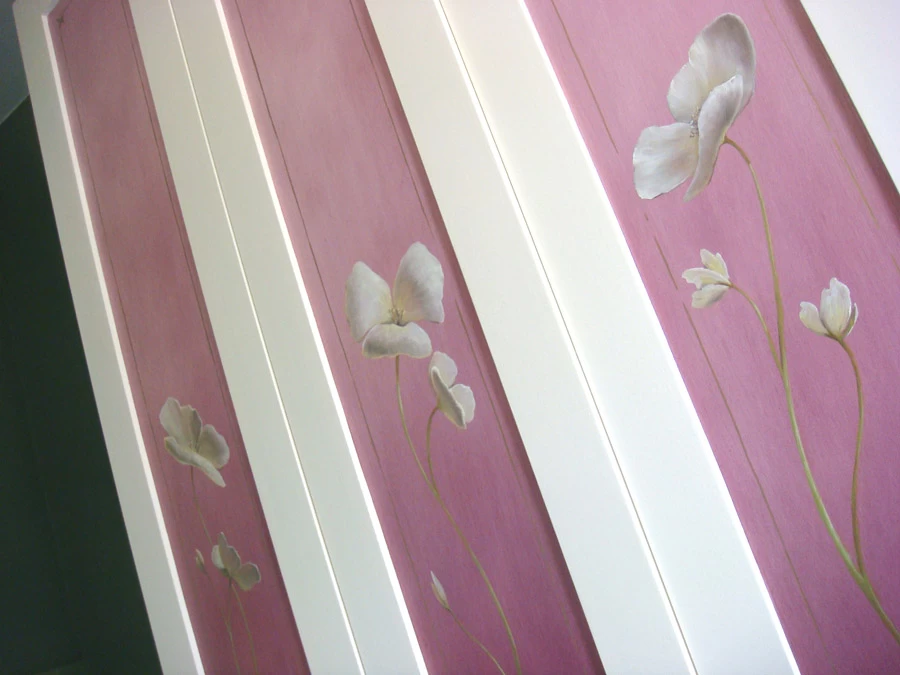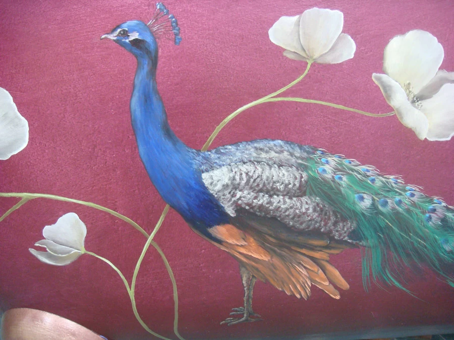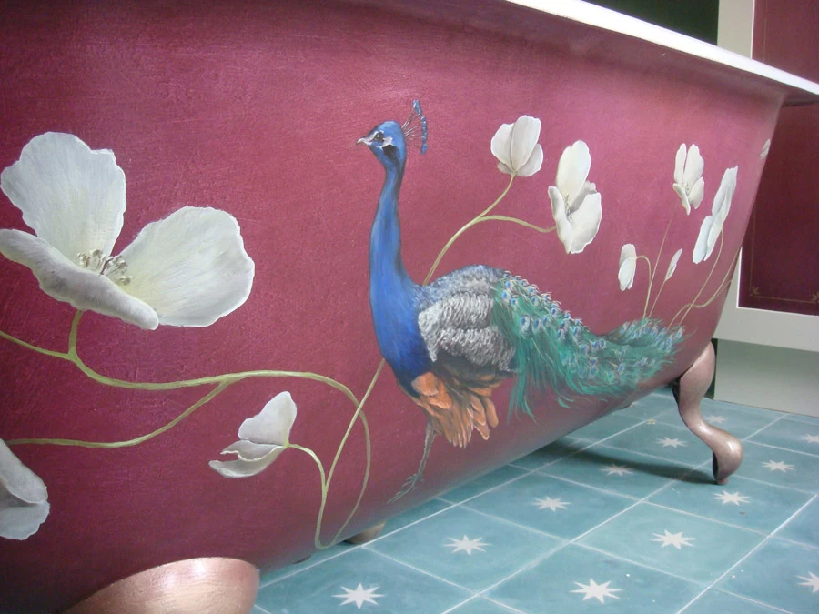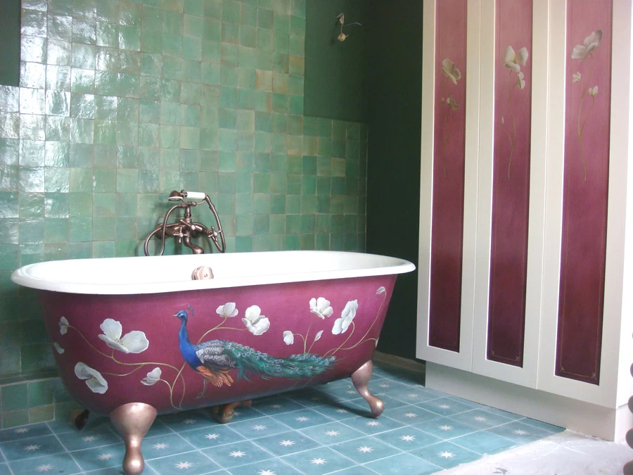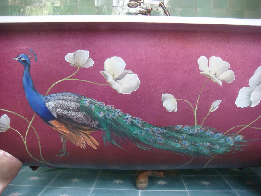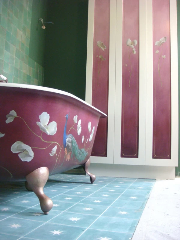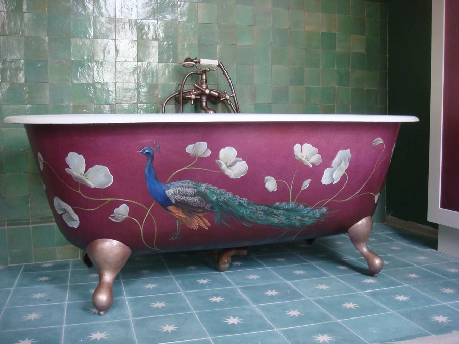 Voici une ancienne baignoire ayant un thème inattendu, original et très sympa : un paon et quelques grosses fleurs blanches sur fond de patine violine. Un rappel de patines et de fleurs sur les portes de placards et une bronzine imitant l’aspect des robinetteries pour harmoniser l’ensemble de la pièce.