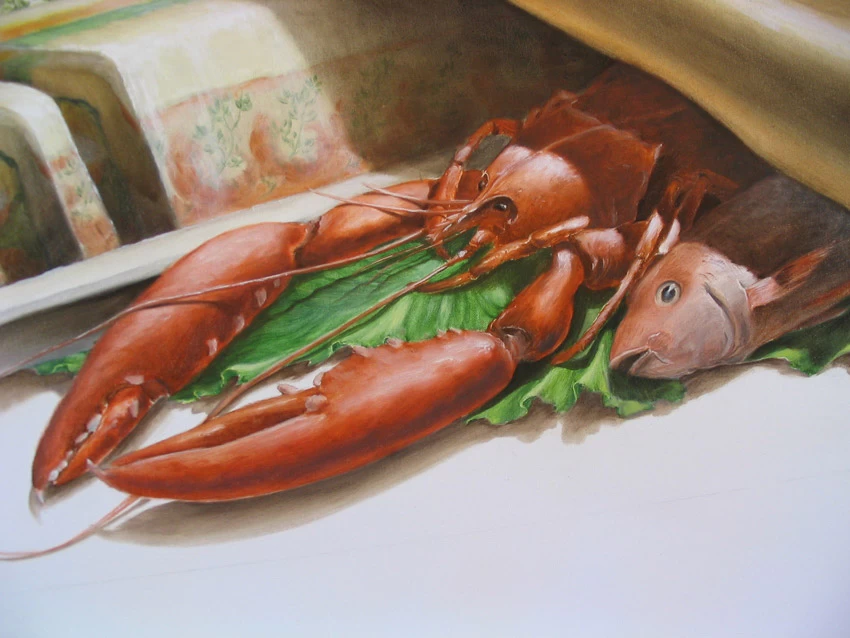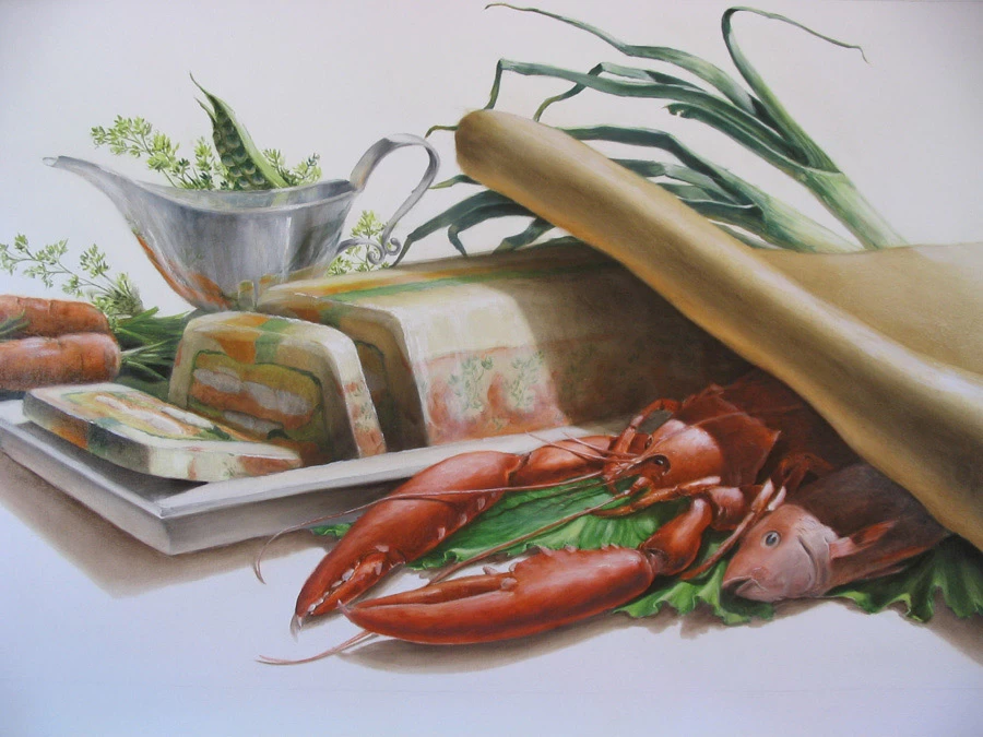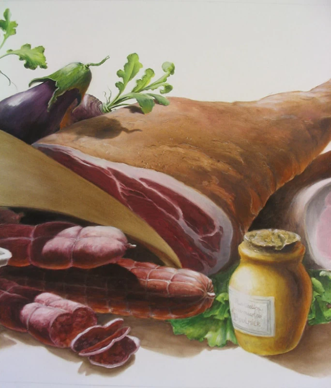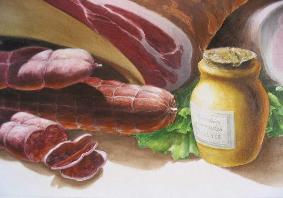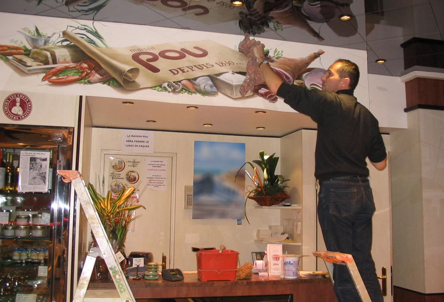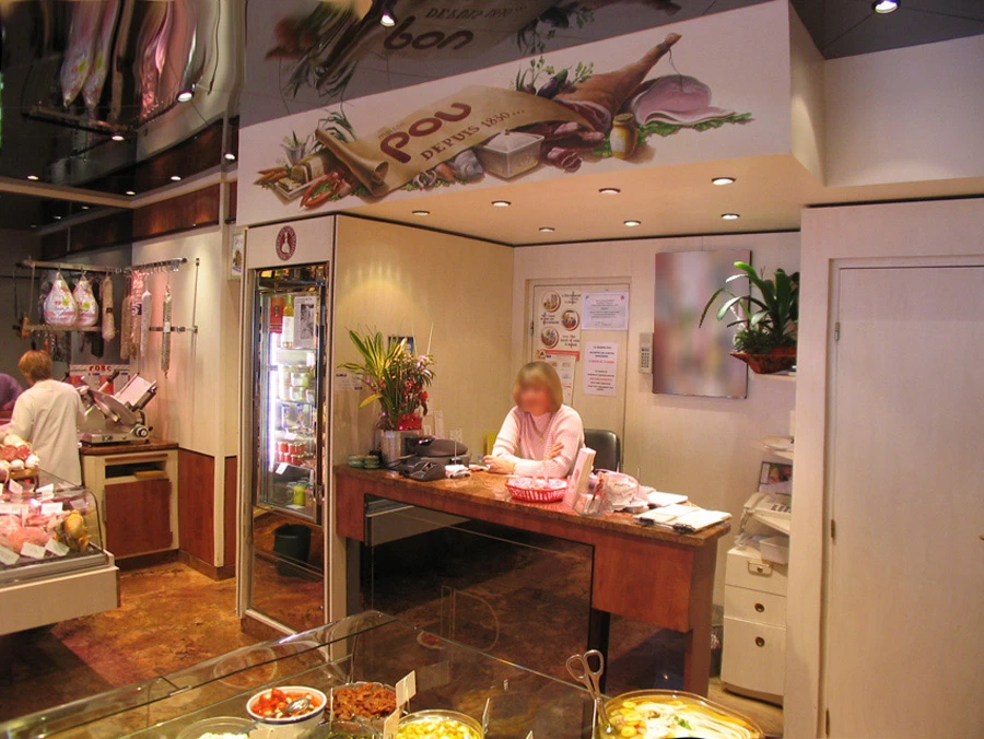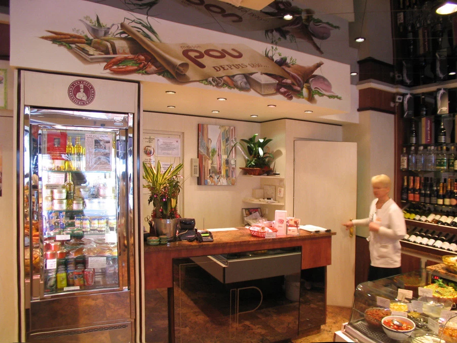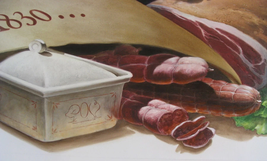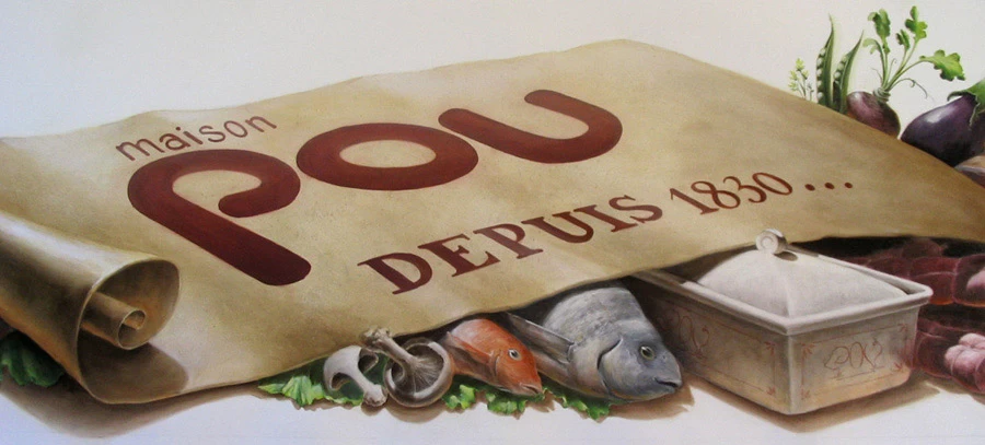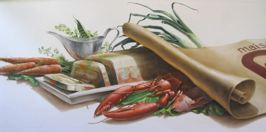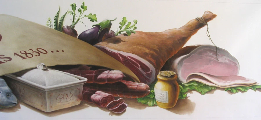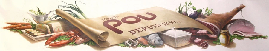 Voici un bandeau de dessus de caisse pour la Maison POU avenue des Ternes à Paris, charcutier traiteur depuis 1830. Cet ensemble traité façon "nature morte" réunit un certain nombre de denrées de qualité distribuées par la Maison POU. Pour information, la décoration générale à été refaite.
