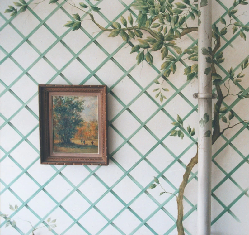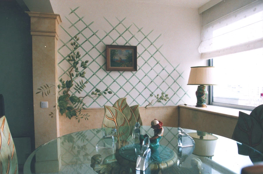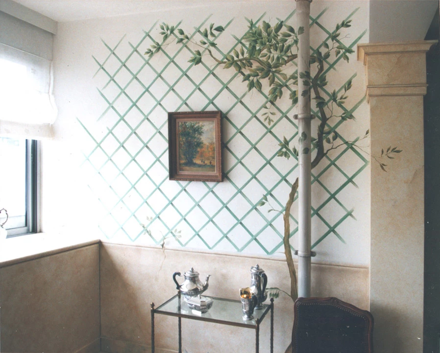 Dans une ex-loggia/balcon devenue salle à manger, réalisation d’un faux treillis et sa végétation, en incorporant un véritable tuyau de gouttière en pvc traité en faux zinc